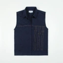 Vest biru tua yang memadukan suasana langit malam dengan detail unik. Aksen tali di bagian dada menghadirkan elemen maskulin yang tegas, sementara motif ketupat di dada mencerminkan keteraturan dan kekuatan, menggambarkan harmoni dalam keterhubungan antar elemen kehidupan. Sulaman tangan berwarna cokelat melengkapi desain dengan sentuhan tradisional yang halus namun penuh makna, seolah melambangkan bintang-bintang yang tersebar di langit malam.