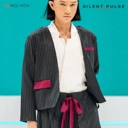 Set ini terdiri dari outer dan celana hitam dengan motif garis putih yang tegas dan terstruktur. Aksen merah di bagian saku dan tali celana menjadi pulse point dengan titik kecil yang menyiratkan energi tersembunyi di balik tampilan yang tenang dan tertata. Dipadukan dengan kemeja putih sebagai lapisan dasar, Pulsepoint merepresentasikan ketegasan yang tidak berteriak, dan detail yang berbicara hanya pada mereka yang memperhatikan.